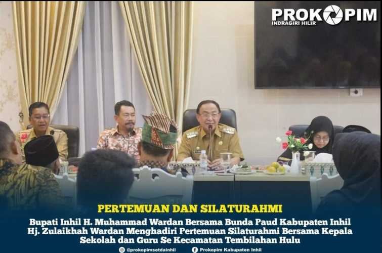 KILASRIAU.COM - Bupati Inhil Drs. H. Muhammad Wardan, MP bersama Ketua TP PKK Kabupaten Inhil yang juga merupakan Bunda Paud Kabupaten Inhil Hj. Zulaikhah Wardan menghadiri pertemuan dan silaturahmi dengan Kepala Sekolah dan Guru se Kecamatan Tembilahan Hulu, Kamis (17/01/2023).
