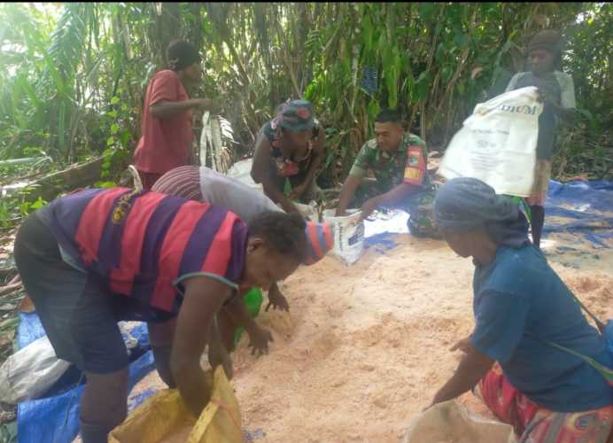 Salah satunya, seperti adanya Babinsa Pantai Barat, Sertu Supriyanto yang telah bersinergi membantu warga mengolah sagu untuk selanjutnya dikonsumsi warga, Minggu (29/01/2023) pagi.