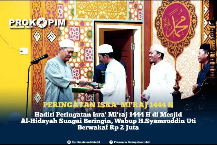 Kilasriau.com - Bertepatan malam 10 Rajab 1444 H, Wakil Bupati H.Syamsuddin Uti secara lansung menghadiri peringatan Isra' Mi'raj 1444 H yang dilaksanakan di Mesjid Al-Hidayah Jl.Stadion Sungai Beringin, Rabu (1/2/2023)