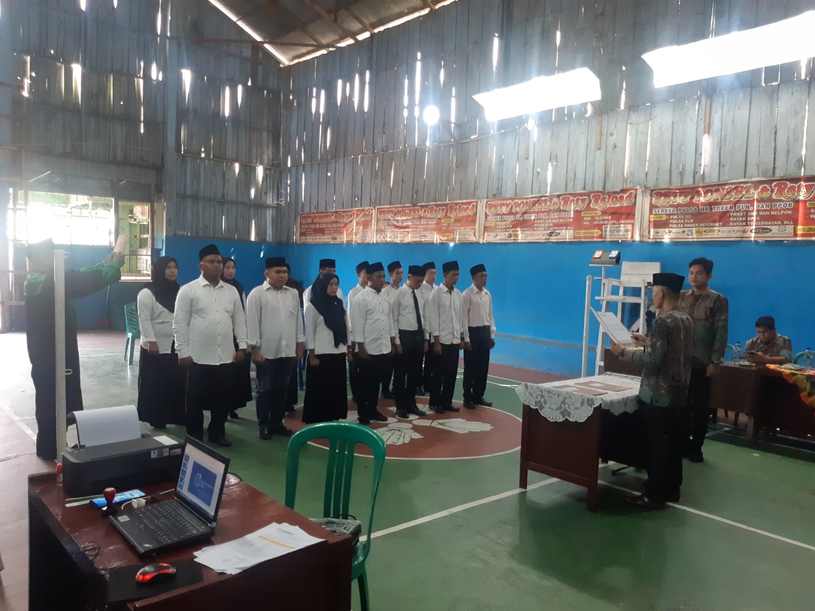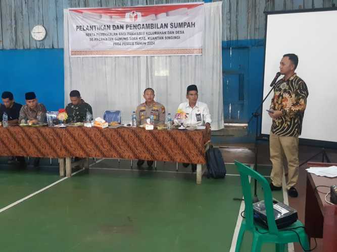 GUNUNG TOAR, KUANSING - Sebanyak 14 Panitia Pengawas Pemilihan Umum Desa dan Kelurahan (PKD) se-Kecamatan Gunung Toar secara resmi dilantik dan dikukuhkan. Pelantikan ini dilakukan oleh Ketua Pengawas Pemilihan Umum (Panwaslu) Kecamatan Gunung Toar Ulil Amri, di GOR Kecamatan Gunung Toar, Senin (06/02/2023).