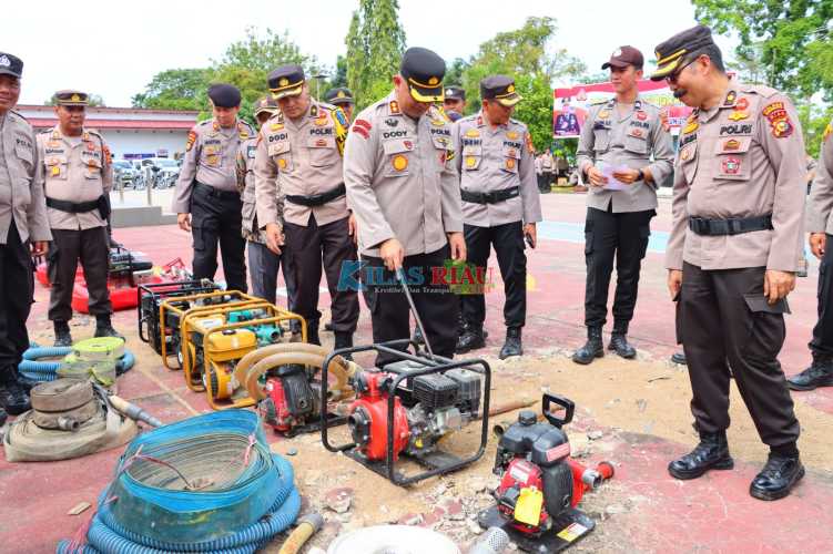 Selepas berikan amanat, Kapolres mengecek kelengkapan sarana dan prasarana penanggulangan Karhutla yang dihampar dilapangan apel.