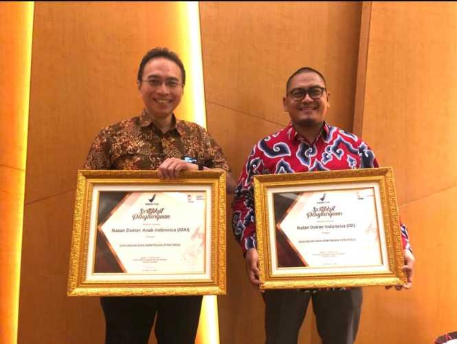 Penerimaan penghargaan terhadap PB IDI diterima oleh Dr Ulul Albab, SpOG, Sekretaris Jendral (Sekjen) PB IDI dan IDAI diterima oleh Dr Piprim Basarah Yanuarso, SpA(K), Ketua Pengurus Pusat IDAI.