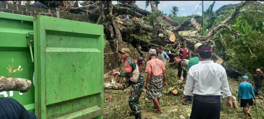 Kilasriau.com, Klungkung - Aparat Babinsa, Bhabinkamtibmas dan warga di Pura Puseh, Desa Adat Dwi Kukuh Lestari, Dusun Penangkidan, Kecamatan Nusa Penida, Kabupaten Klungkung langsung melakukan pembersihan akibat tumbangnya pohon asem berusia ratusan tahun.