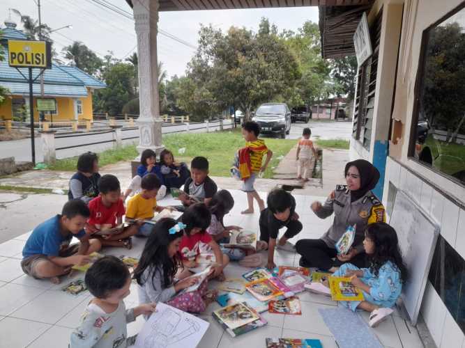 Buka Pojok Baca, Bhabinkamtibmas Briptu Fitrian Belajar Dengan Anak-anak Suak Lanjut Siak