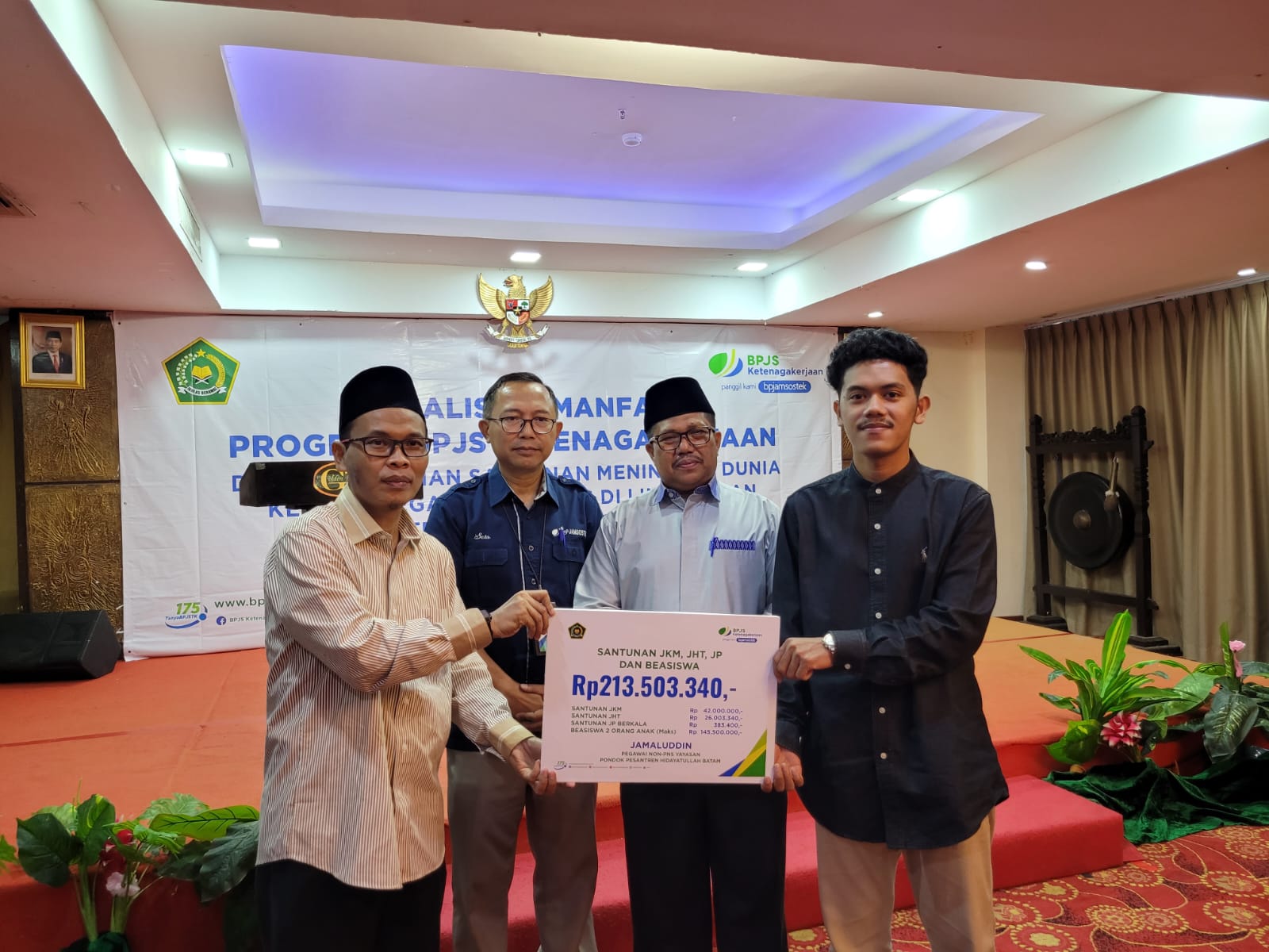 Dikesempatan ini juga dilakukan penyerahkan santunan Program jaminan Kematian dari BPJS Ketenagakerjaan kepada ahli waris Alm. Agus Harjanto Pegawai Non PNS MTSN 2 Kota Batam senilai 42 Juta Rupiah, dan Jaminan Kematian serta beasiswa kepada Alm. Jamaluddin Pegawai Non PNS Pesantren Hidayatullah Batam Senilai kurang lebih 213 juta rupiah.