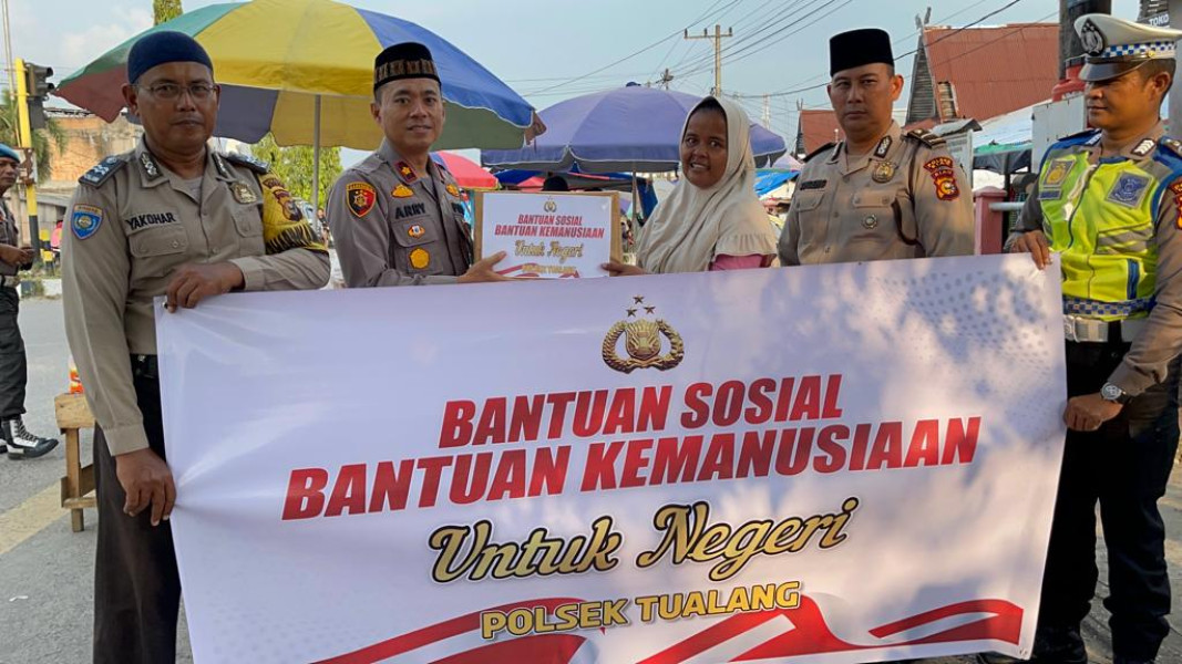 Kapolres Siak AKBP RONALD SUMAJA S.I.K melalui Kapolsek Tualang KOMPOL ARRY PRASETYO.SH.MH didampingi oleh PJU Polsek Tualang dan Personil Polsek Tualang menerangkan kegiatan ini bertemakan pemberian bantuan kemanusiaan untuk Negeri, dengan menyalurkan paket sembako berupa beras, gula, susu, mie instan, minyak goreng ke pada warga yang membutuhkan.
