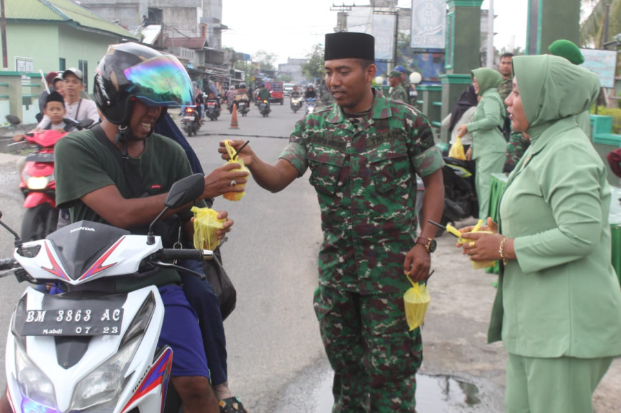 Kilasriau.com — Prajurit Kodim 0314/Inhil bersama Persit KCK Cabang LIV Dim 0314/Inhil membagikan Takjil kepada masyarakat yang melintas di depan Makodim atau sepanjang jalan A.Yani, kecamatan Tembilahan Hulu kabupaten Indragiri Hilir.