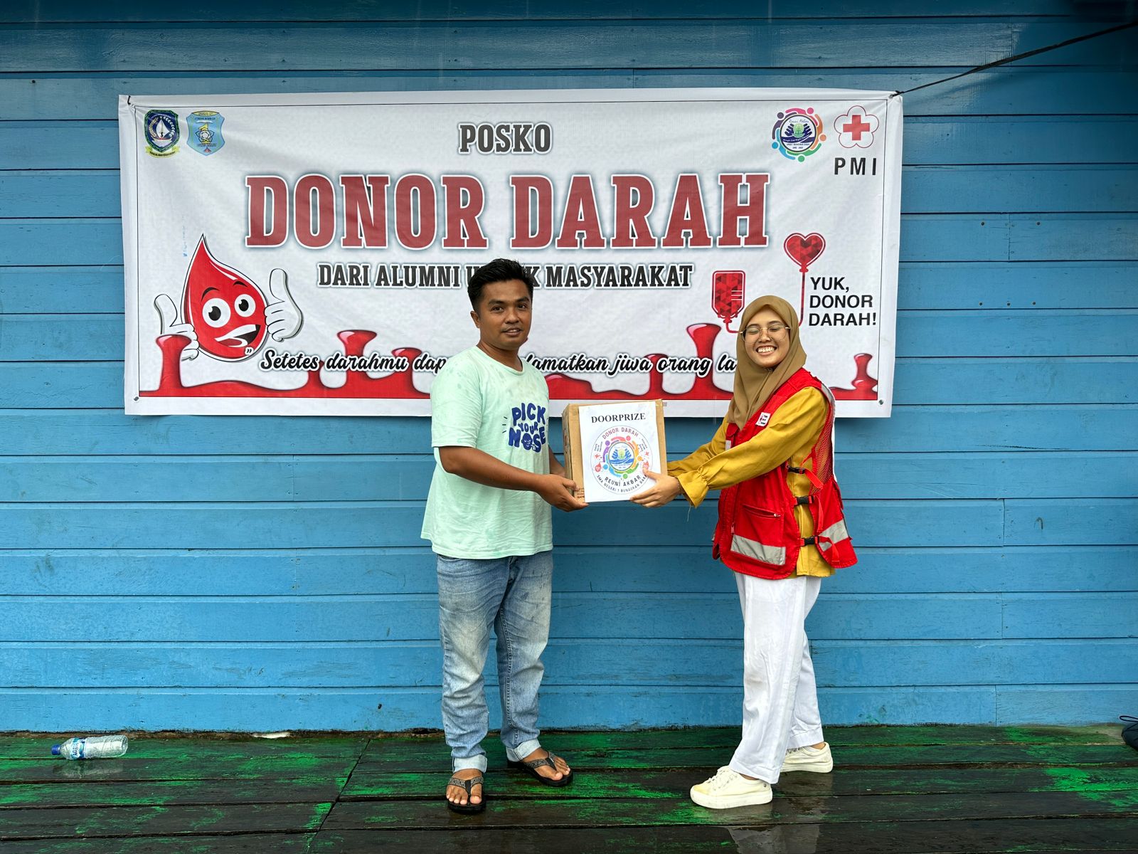 Menutupi kegiatan donor darah tampak diserahkan beberapa doorprize kepada masyarakat yang ikut serta mendonorkan darah dan yang memenangkan nomor undian.