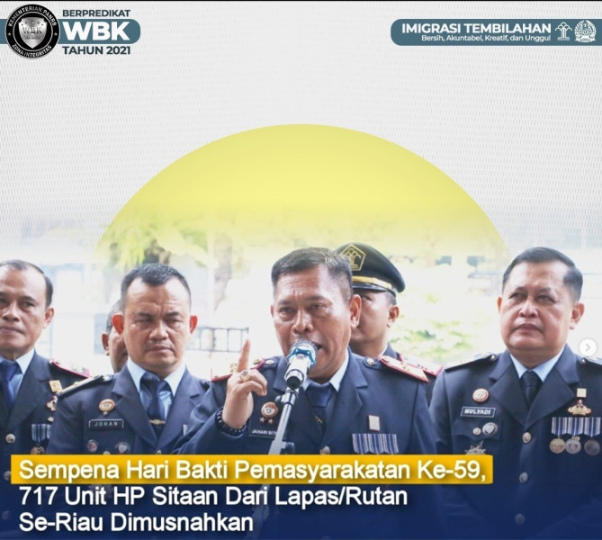 Bersamaan dengan puncak perayaan Hari Bakti Pemasyarakatan ke-59, pemusnahan barang bukti dilakukan sebagai bukti komitmen jajaran Kementerian Hukum dan HAM Riau dalam mengamankan lapas dan rutan dari barang-barang yang dianggap potensial mengganggu keamanan dan ketertiban Warga Binaan Pemasyarakatan.