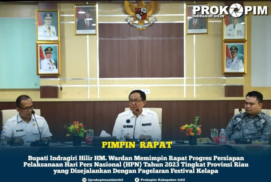 Kilasriau.com - Bupati Indragiri Hilir HM. Wardan memimpin rapat progres persiapan pelaksanaan Hari Pers Nasional (HPN) Tahun 2023 tingkat Provinsi Riau yang disejalankan dengan pagelaran festival kelapa, Rabu (03/05/2023).