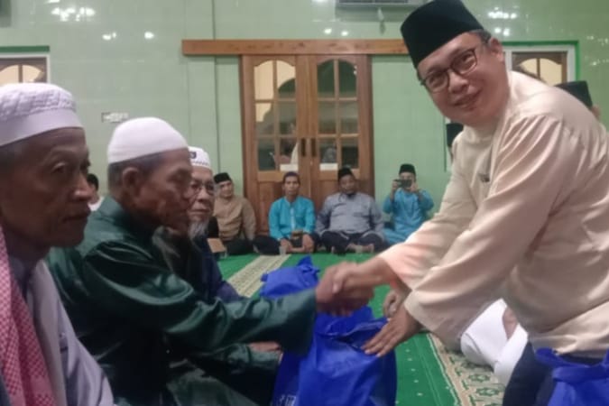 Menutupi kegiatan Safari Ramadhan, Wan Siswandi Bupati Natuna bersama Ketua DPRD Kabupaten Natuna Daeng Amhar, menyerahkan bantuan paket sembako secara simbolis bagi warga yang kurang mampu.