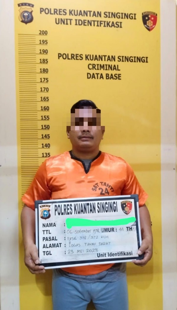 TELUK KUANTAN - Sat Reskrim Polres Kuansing mengungkap penipuan jual beli tanah dengan kerugian korban mencapai Rp. 390 juta, seorang laki-laki berinisial J als M asal Desa Perhentian Luas Kecamatan Logas Tanah Darat Kabupaten Kuantan Singingi (Kuansing), Riau, diamankan di Polres Kuansing, Senin (22/05/2023) sekira pukul 09.45 WIB.