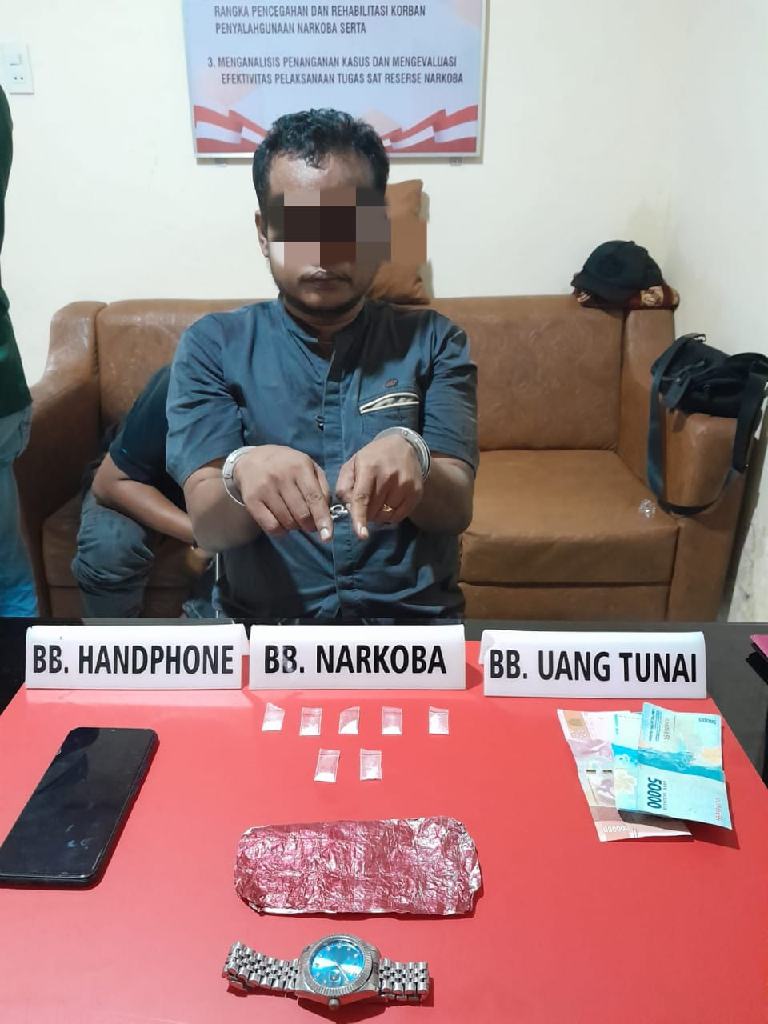 Barang bukti yang diamankan yaitu, 7 paket Narkoba jenis shabu-shabu yang dibungkus dengan plastik bening, (Bruto 1.17 Gram), HP merk Vivo, jam tangan, selembar kertas timah rokok, uang hasil penjualan Ro 200 ribu.