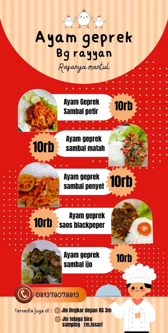"Kami menjual ayam geprek dengan harga Rp10.000an perporsinya, diaman 1 porsi sudah lengkap dengan nasi, ayam, lalapan dan sambal yang bisa dipilih oleh pelanggan," ujar Anita pemilik Ayam Geprek Bg Rayyan.
