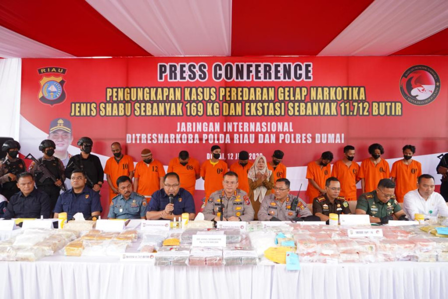 “Tergelarnya barang bukti 168.89 kilogram Narkotika Bukan Tanaman Jenis Shabu dan 11.712 butir Narkotika Bukan Tanaman Jenis Pil Ekstasi berhasil kita sita dari 7 kasus Tindak Pidana Penyalahgunaan Narkoba, yang mana 4 kasus dengan 5 tersangka berhasil diungkap oleh Polres Dumai sementara 3 kasus dengan 4 tersangka lainnya berhasil diungkap oleh Ditresnarkoba Polda Riau,” jelas Kapolda Riau Irjen Pol Mohammad Iqbal, S.I.K, M.H.