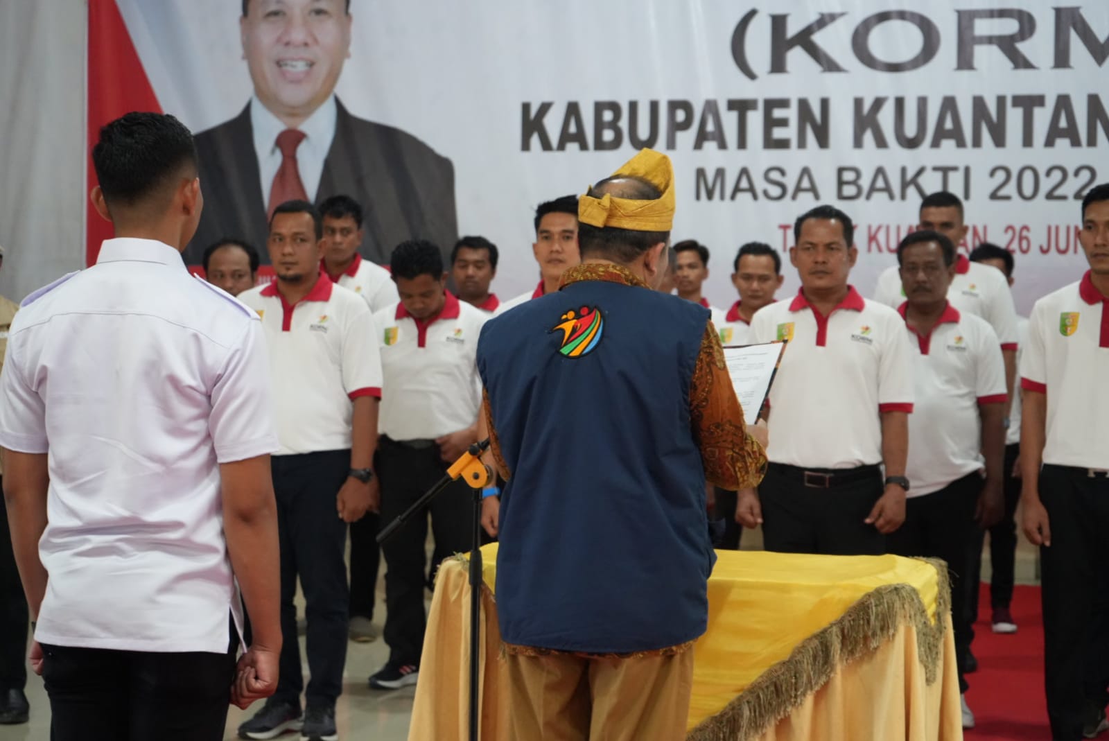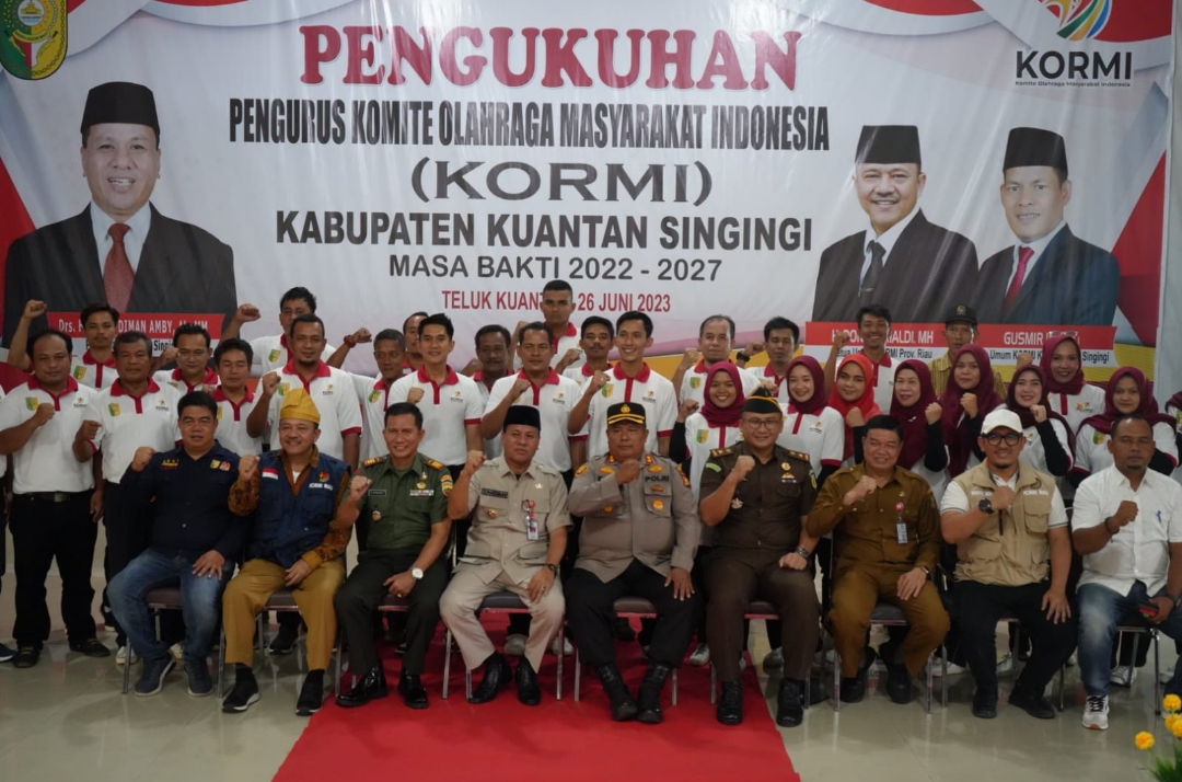 TELUK KUANTAN - Pengukuhan Pengurus Komite Olahraga Masyarakat Indonesia (KORMI) Kabupaten Kuantan Singingi Masa Bakti 2022-2027 oleh Ketua KORMI Riau, H Doni Aprialdi, dengan ketua terlantik Gusmir Indra, di Pendopo Rumah Dinas Bupati Kuantan Singingi, Senin (26/06/2023).