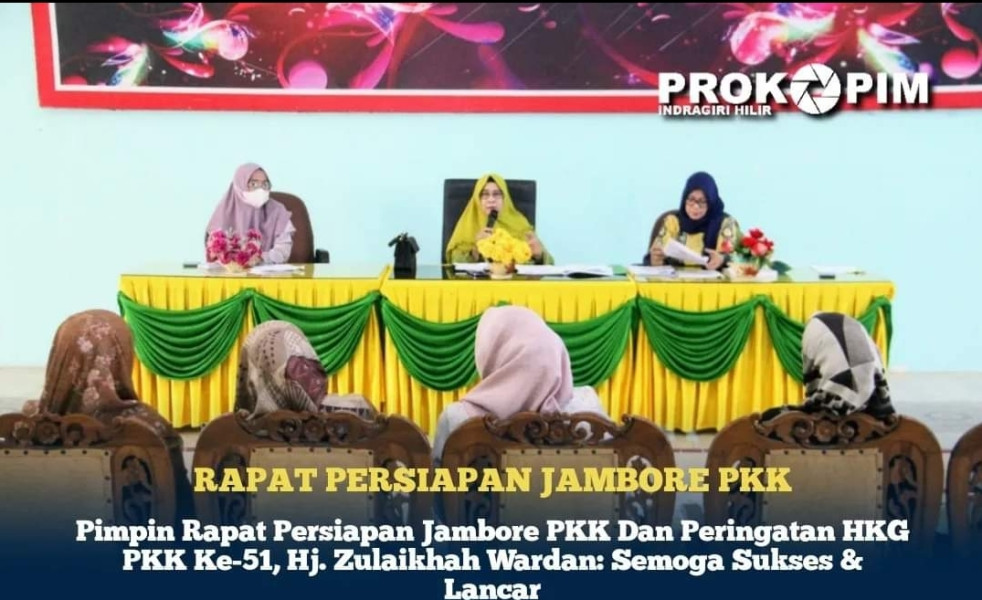 Rapat dipimpin langsung Ketua TP PKK Inhil Hj. Zulaikhah Wardan, diikuti para pengurus TP PKK Inhil Apa yang dibutuhkan guna mendukung suksesnya kegiatan yang akan digelar pada tanggal 13 – 14 July 2023 untuk jambore PKK yang akan di laksanakan di halaman kantor bupati Inhil, sedangkan untuk puncak peringatan hari Kesatuan Gerak PKK di laksanakan pada tanggal 15 July 2023 di gedung Engku Kelana di Tembilahan ini dibahas dalam rapat tersebut.