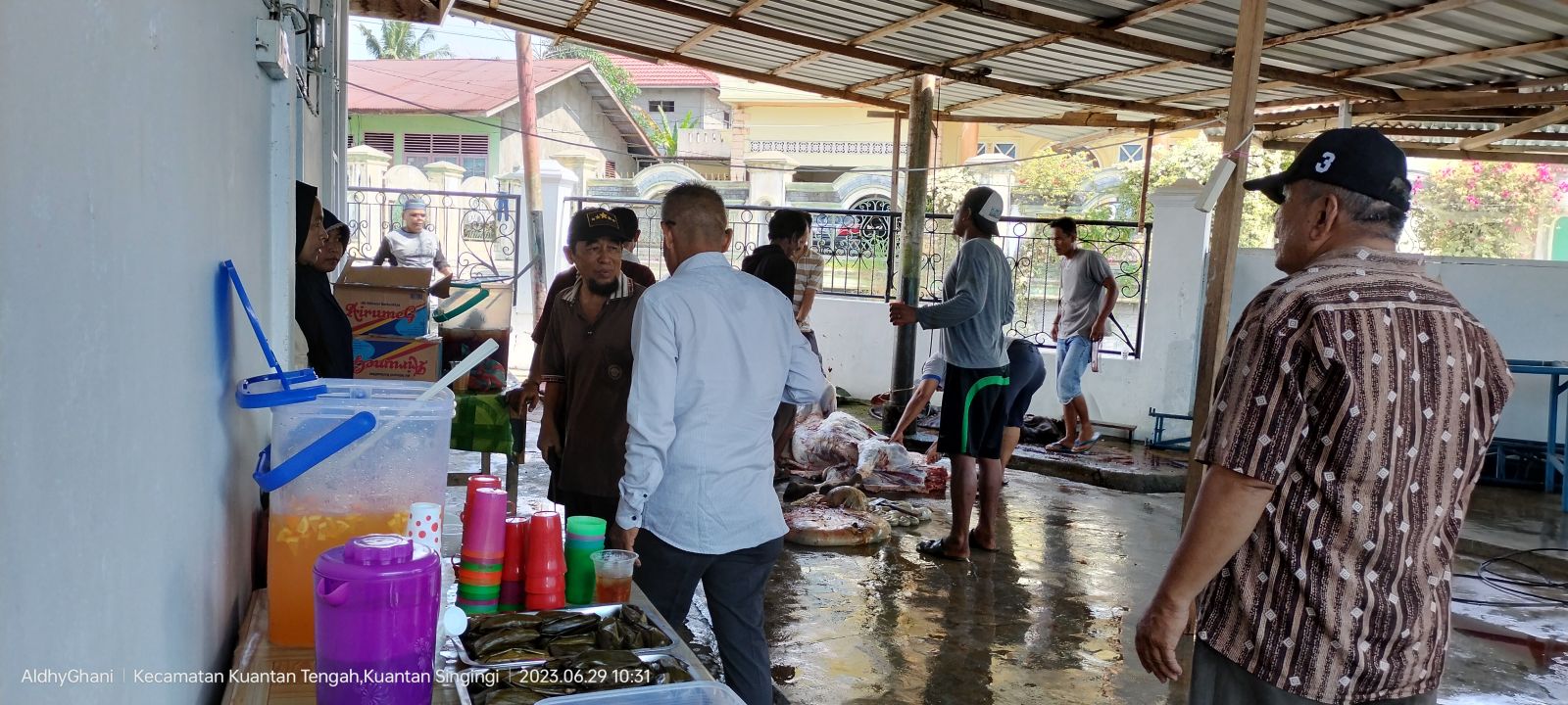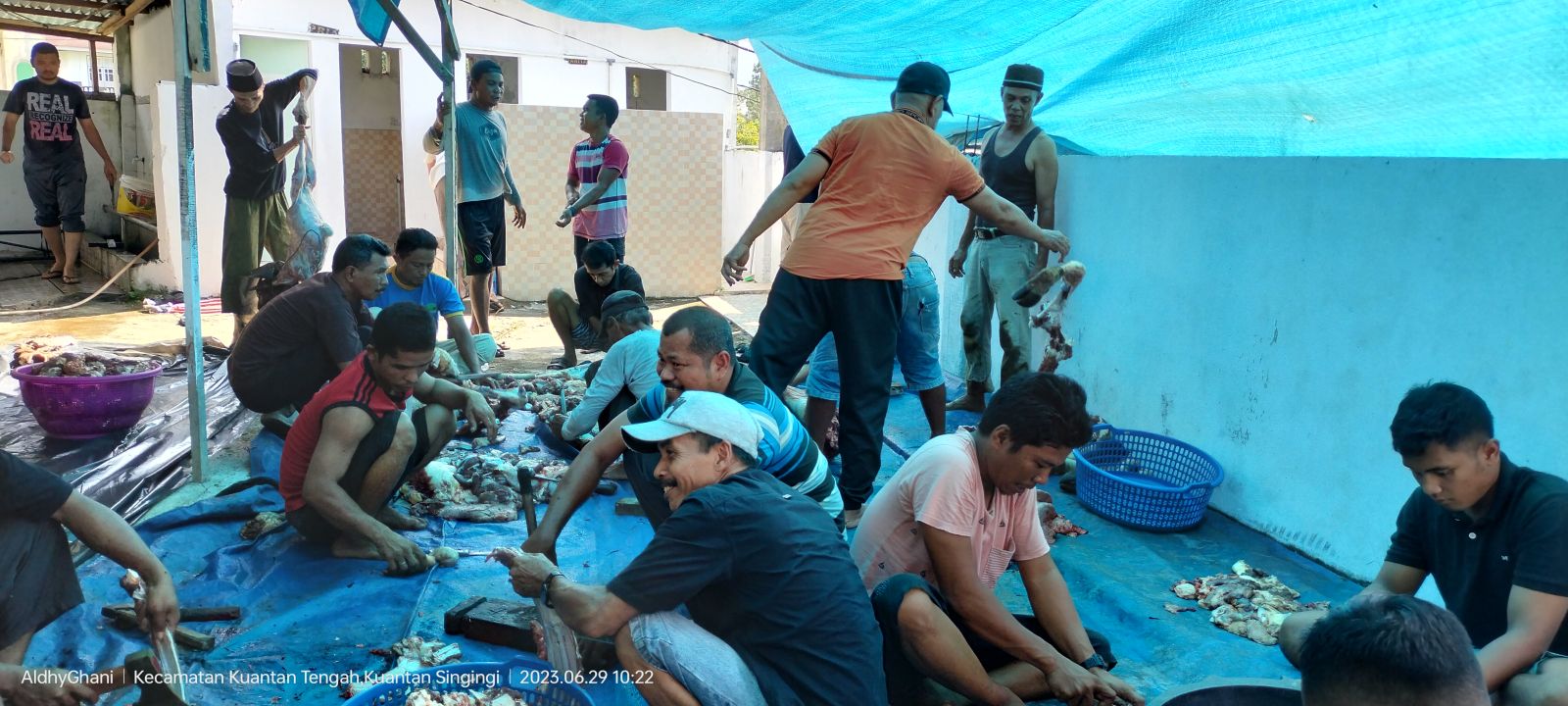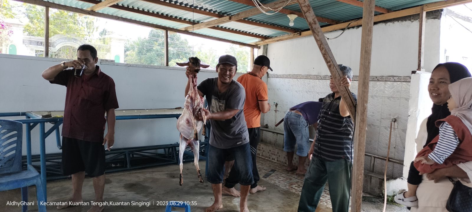 KOTO TALUK, KUANSING - Ketua Mushalla Al Ikhlas bersama panitia qurban bekerjasama melaksanakan acara penyembelihan hewan qurban yang bertepatan 10 Zulhijah 1444 H, di halaman Mushalla Al Ikhlas Perumnas Koto Taluk, RT 06, RW 03, dusun Tobek Panjang, desa Koto Taluk, kecamatan Kuantan Tengah, kabupaten Kuantan Singingi, Riau, yang setiap tahunnya di adakan dalam rangka menyambut hari Raya Idul Adha.