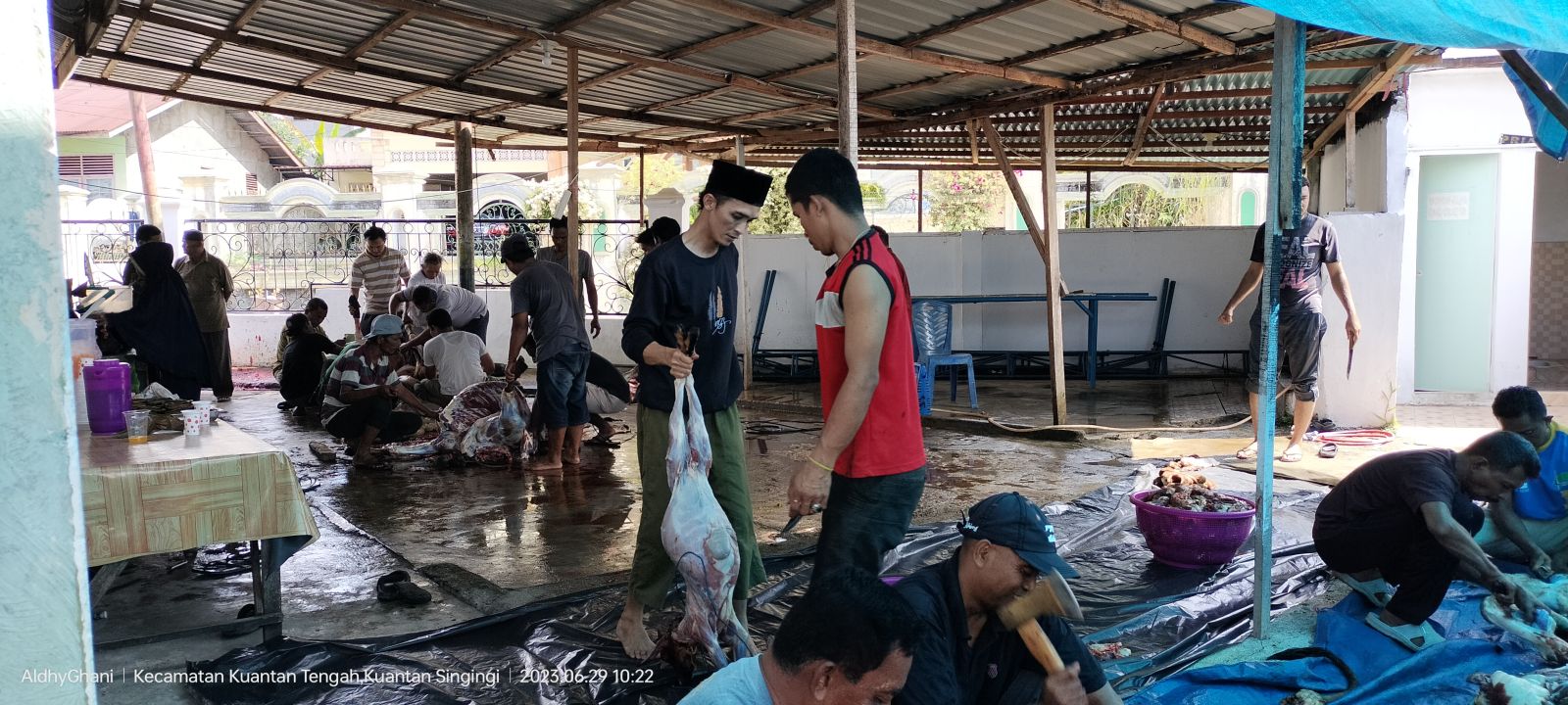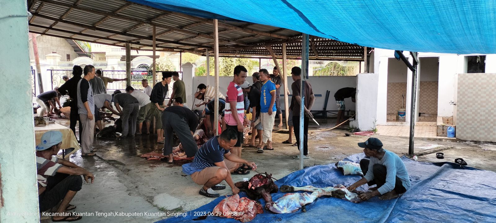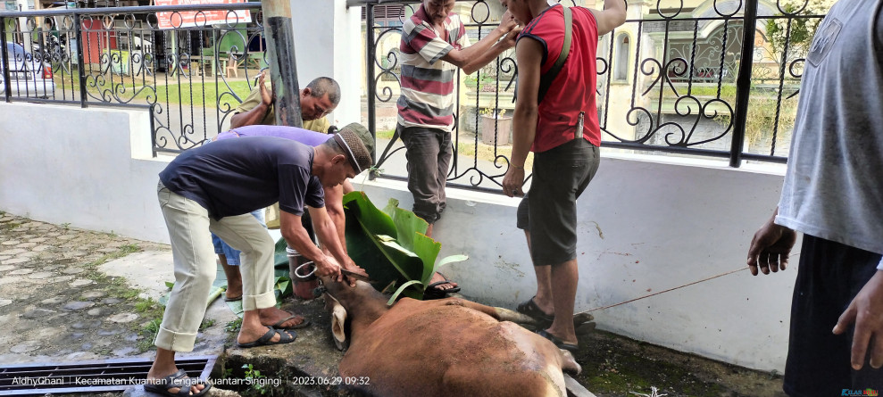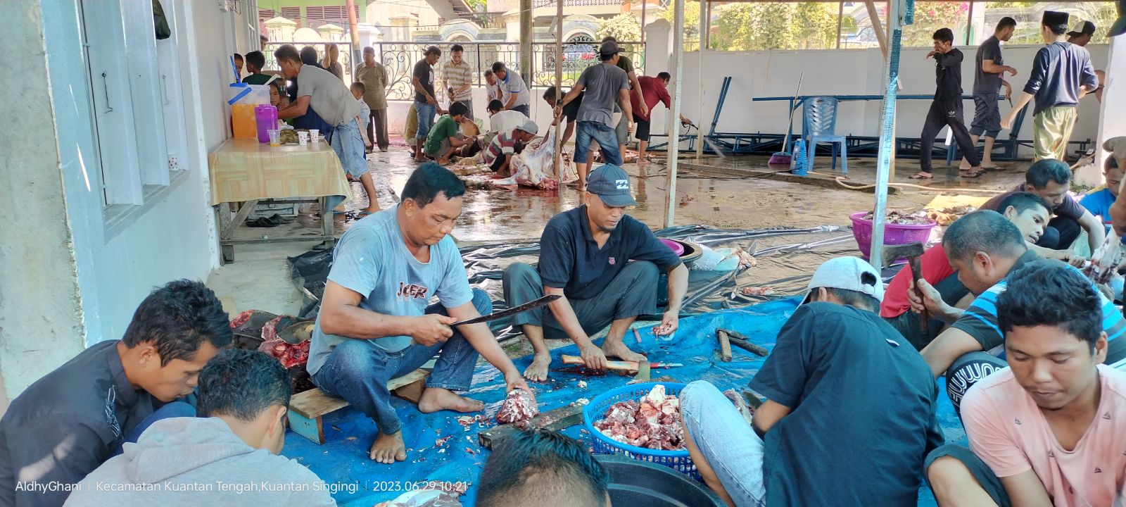 KOTO TALUK, KUANSING - Ketua Mushalla Al Ikhlas bersama panitia qurban bekerjasama melaksanakan acara penyembelihan hewan qurban yang bertepatan 10 Zulhijah 1444 H, di halaman Mushalla Al Ikhlas Perumnas Koto Taluk, RT 06, RW 03, dusun Tobek Panjang, desa Koto Taluk, kecamatan Kuantan Tengah, kabupaten Kuantan Singingi, Riau, yang setiap tahunnya di adakan dalam rangka menyambut hari Raya Idul Adha.