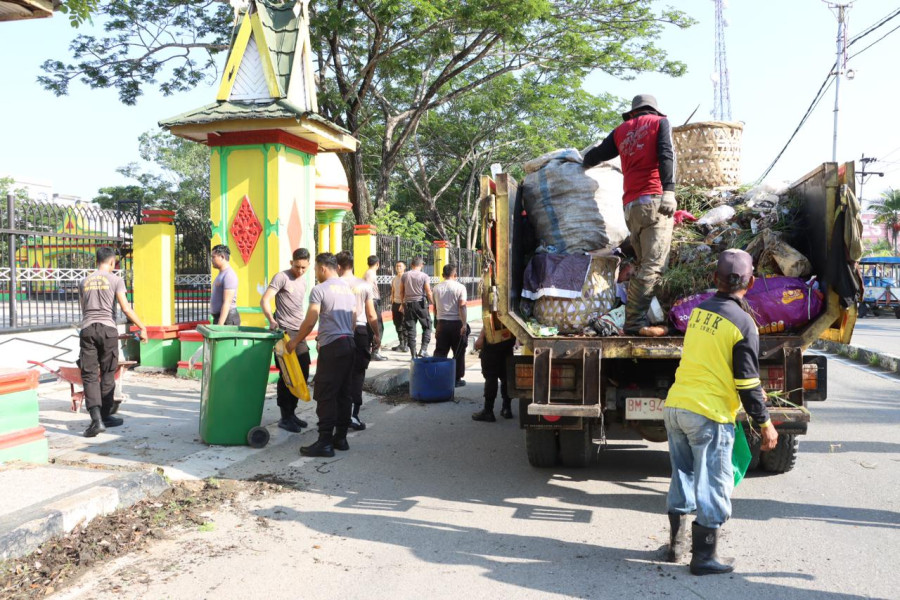 Untuk hal ini bukan senjata api yang digenggam, melainkan sapu lidi dan tong sampah. Puluhan anggota Polri tampak kompak membersihkan halaman taman Gajah Mada dan ruas jalan disekitarnya yang dipenuhi sampah plastik hingga dedaunan.