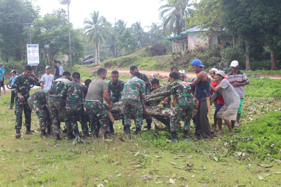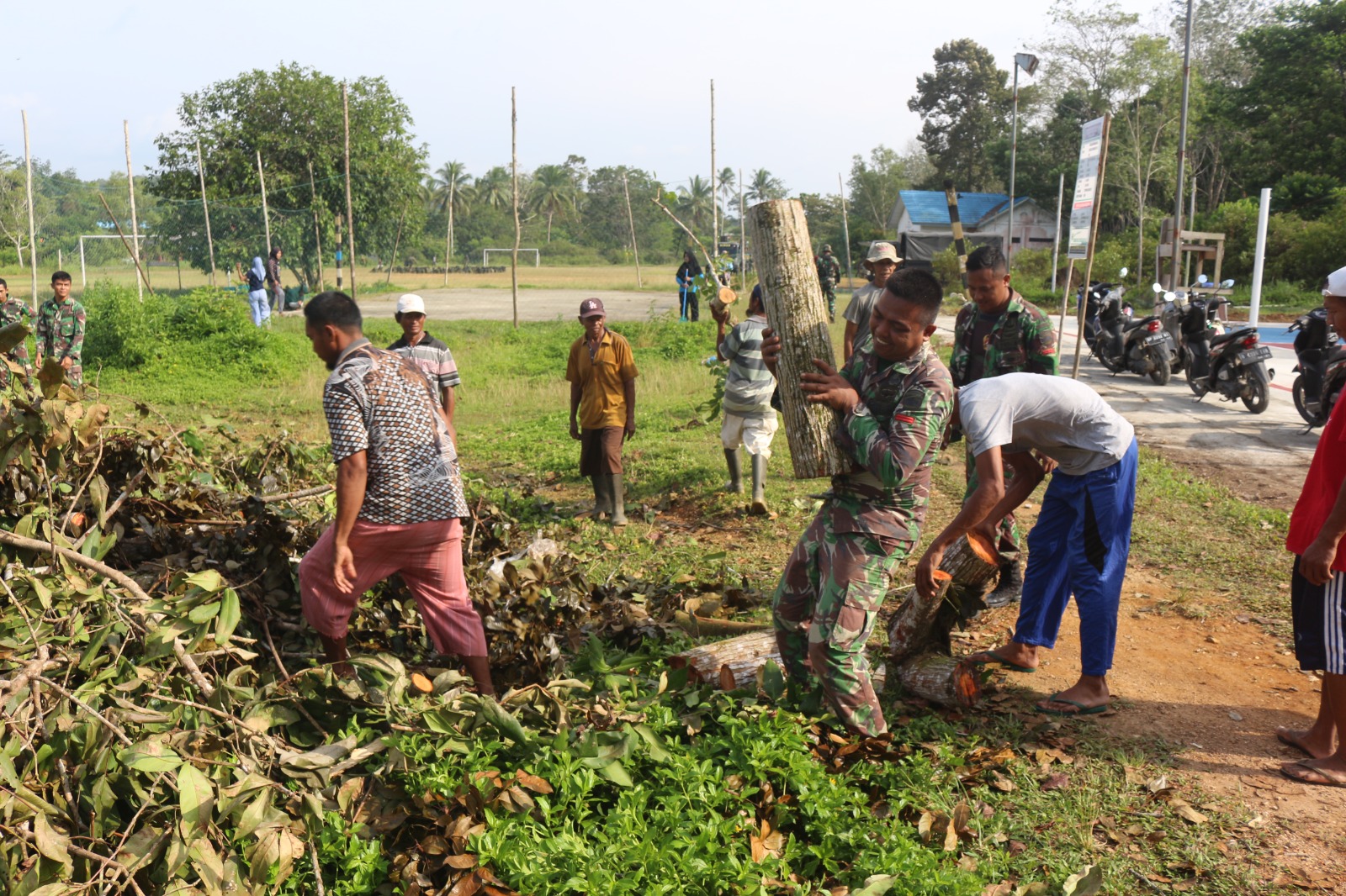 Pukul 08.00 wib, Prajurit Yon Komposit 1/GP bersama dengan masyarakat mulai melakukan pembersihan pada sektor sarana umum diantaranya lapangan sepak bola dan lapangan voli Ds. Air Lengit.