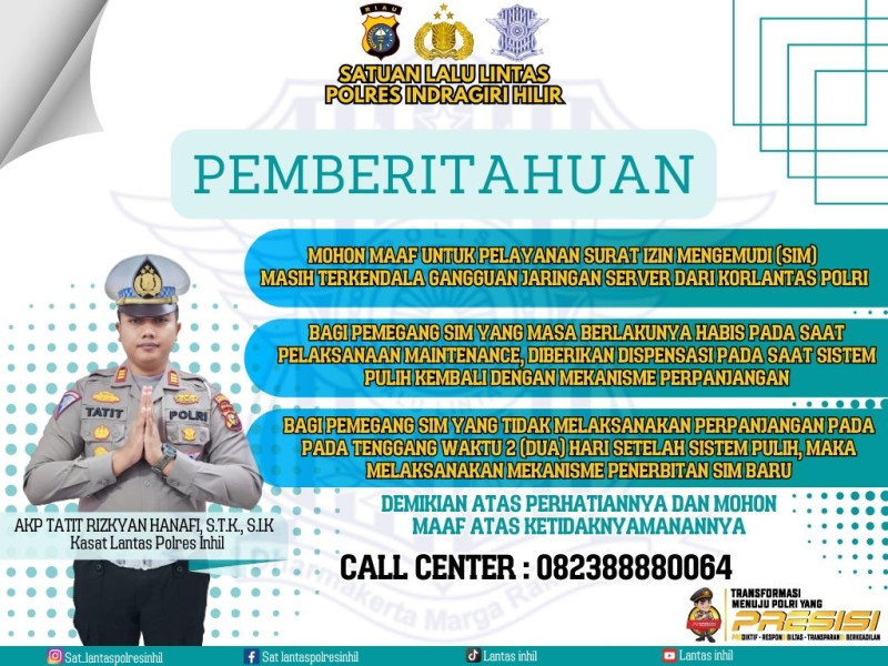 Dengan adanya gangguan tersebut, Kasat Lantas Polres Inhil AKP Tatit Rizkiyan Hanafi, menyampaikan permohonan maaf dan memberikan informasi bagi pemohon SIM, diantaranya.