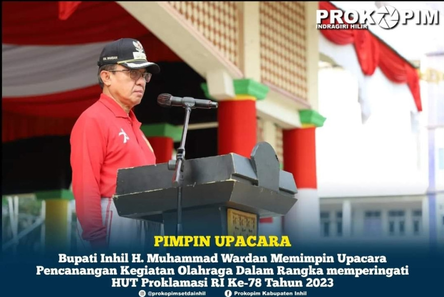Kilasriau.com - Bupati Indragiri Hilir (Inhil) Drs. H. Muhammad Wardan, MP memimpin upacara Pencanangan kegiatan olahraga dalam rangka memperingati Hari Ulang Tahun (HUT) Proklamasi Kemerdekaan Republik Indonesia (RI) Ke-78 Tahun 2023. Bertempat di Lapangan Gajahmada Tembilahan, Minggu (13/08/2023).