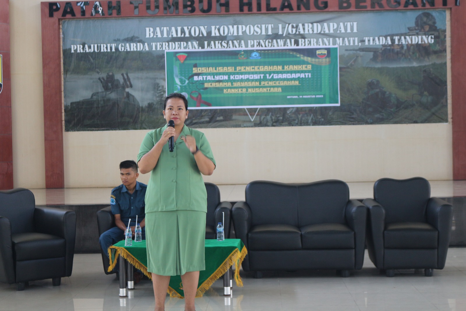 "Kegiatan sosialisasi ini bertujuan untuk memberikan informasi kepada prajurit dan Persit Batalyon Komposit 1/GP terkait dengan Kanker dan Tumor dengan harapan dapat mengenali sedini mungkin gejala Kanker dan Tumor agar dapat mengambil langkah yang tepat serta mengetahui pola hidup yang sehat untuk menghindari terkena Kanker dan Tumor," ucap Ny. Rouli Yunita Robert Panjaitan.