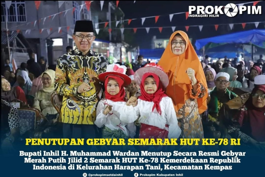 KILASRIAU.com - Bupati Indragiri Hilir (Inhil) H. Muhammad Wardan bersama Istri Hj. Zulaikhah Wardan Ketua TP PKK Kabupaten Inhil menghadiri malam Puncak Gebyar Merah Putih Jilid 2 dalam rangka memeriahkan Hari Ulang Tahun (Hut) Ke-78 Kemerdekaan Republik Indonesia (RI) Tahun 2023 di Kelurahan Harapan Tani Kecamatan Kempas.