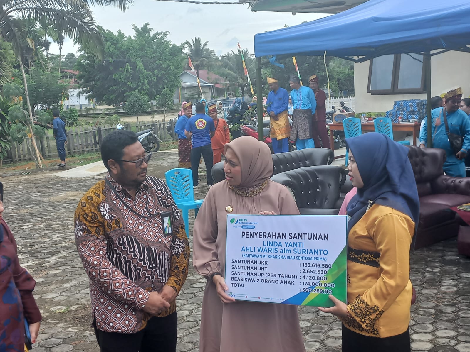 Penerima santunan kedua ahli waris almarhum Surianto, karyawan PT Kharisma Riau Sentosa Prima. Manfaat yang diterima adalah Jaminan Kecelakaan Kerja (JKK) : Rp. 183.616.580, Beasiswa anak : Rp. 174.000.000, Jaminan Hari Tua (JHT) : Rp. 2.652.530, Santunan Jaminan Pensiun (JP Per Tahun) : Rp. 4.120.800. Sehingga Total Rp. 360.269.110.