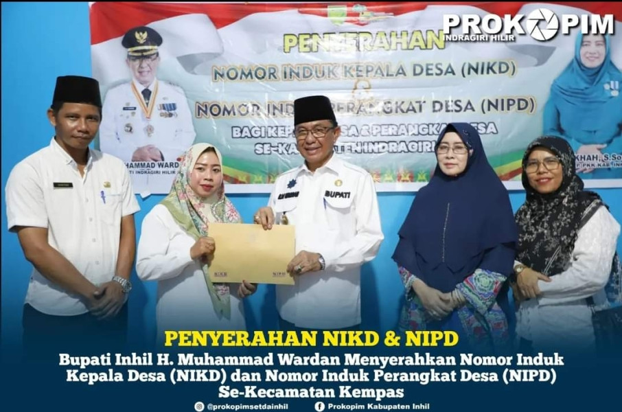 Penyerahan NIKD dan NIPD ini diserahkan langsung oleh Bupati H. Muhammad Wardan dengan didampingi Ketua TP PKK Inhil Hj. Zulaikhah Wardan, Kadis PMD Dwi Budiyanto serta Camat Kempas Sumitro.