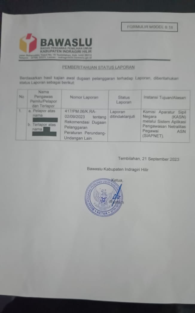 Dalam pemberitahuan status laporan tertanggal 21 September 2023 yang ditandatangani Ketua Bawaslu Inhil, Rustam disebutkan bahwa laporan yang disampaikan pelapor diterima dan ditindaklanjuti untuk direkomendasikan atau diteruskan ke KASN melalui sistem Aplikasi Pengawasan Netralitas Pegawai ASN (SIAPNET).