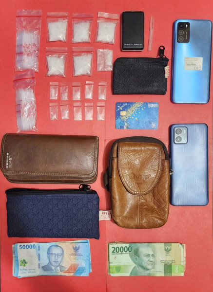 Dari tangan pelaku diamankan 16 paket sedang narkotika jenis sabu berbagai ukuran, 1 buah sendok pipet timbangan digital.