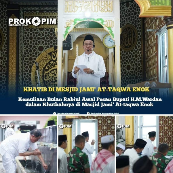 Usai meresmikan kantor Pos Koramil Enok Bupati Indragiri Hilir H.M Wardan berkesempatan menjadi khatib sekaligus menjadi imam sholat Jumat di Masjid Jami' At-taqwa kelurahan Enok Kecamatan Enok, Jumat (06/10/2023).