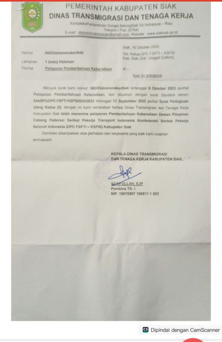 Berkas surat dengan nomor 560/Distransnaker/645 ditujukan kepada Ketua DPC FSPTI-KSPSI Unggal Gultom serta ditandatangani oleh Kepala Dinas Distransnaker Kabupaten Siak Syaifullah, S,IP. Dengan demikian dapat dinyatakan kedudukan Unggal Gultom sebagai Ketua DPC FSPTI-KSPSI Siak sudah jelas.