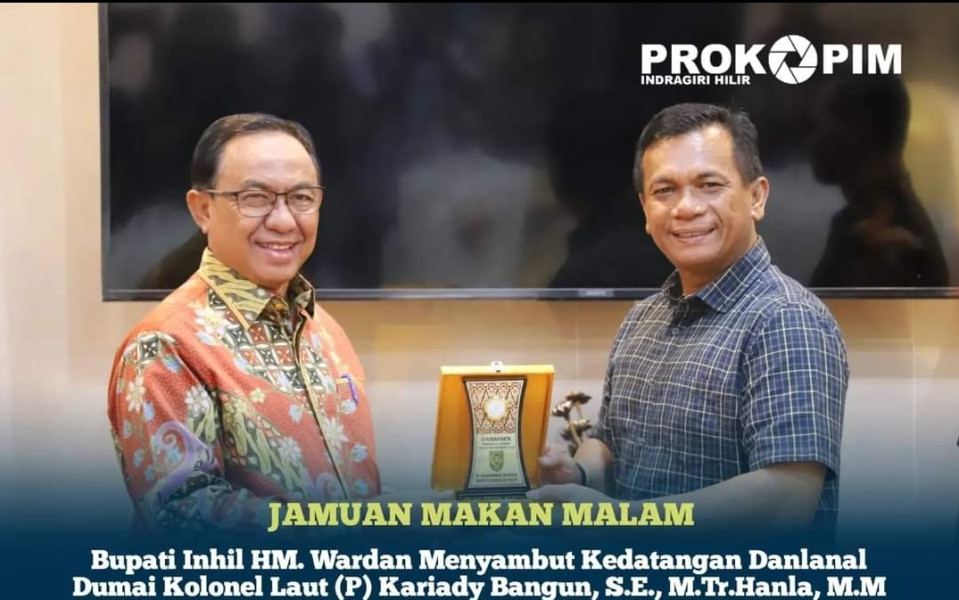 KILASRIAU.com - Bupati Indragiri Hilir (Inhil) H. Muhammad Wardan menyambut dan menjamu kedatangan Komandan Pangkalan TNI Angkatan Laut (Danlanal) Dumai, Kolonel Laut (P) Kariady Bangun, S.E., M.Tr.Hanla, M.M beserta rombongan dengan makan malam bersama di Kediaman Bupati, Selasa (10/10/2023) malam.