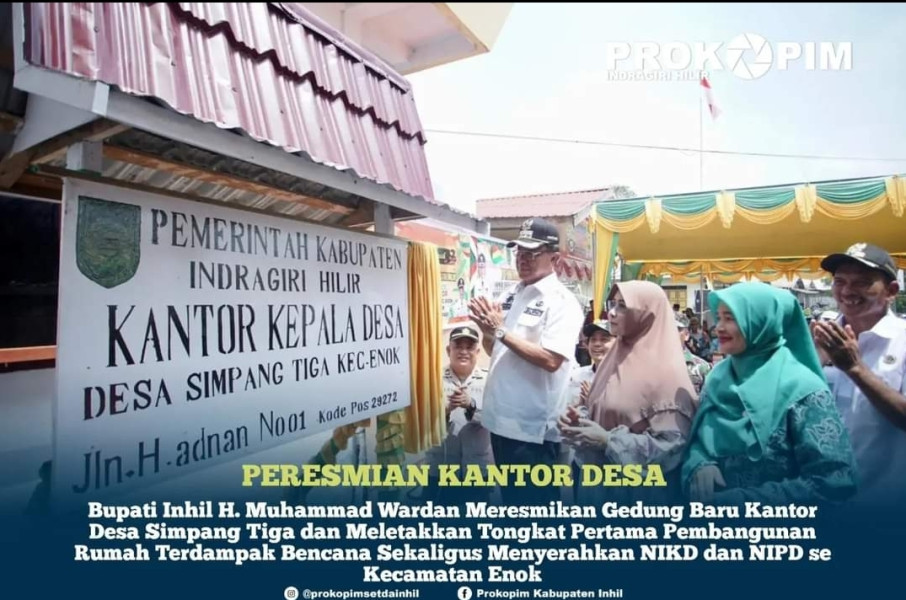 KILASRIAU.com - Bupati Indragiri Hilir (Inhil) H. Muhammad Wardan didampingi Ketua TP PKK Inhil Hj. Zulaikhah Wardan meresmikan Gedung Baru Kantor Kepala Desa Simpang Tiga, Kecamatan Enok dan meletakkan Tongkat Pertama Pembangunan Rumah Terdampak Bencana sekaligus menyerahkan Nomor Induk Kepala Desa (NIKD) dan Nomor Induk Perangkat Desa (NIPD) se Kecamatan Enok, Rabu (11/10/2023).