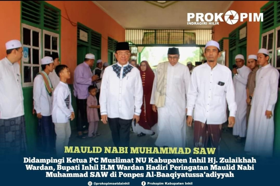 KILASRIAU.com - Bupati Indragiri Hilir H.M Wardan di dampingi ketua TP PKK sekaligus Ketua Muslimat NU Kabupaten Indragiri Hilir H.j Zulaikhah Wardan menghadiri undangan Perayaan Maulid Nabi Muhammad SAW 1445 H yang dilaksanakan oleh Ponpes Al-Baaqiyatussa’adiyyah Jln.Sinar Harapan Parit.6 Tembilahan Barat, Minggu, (15/10/2023).