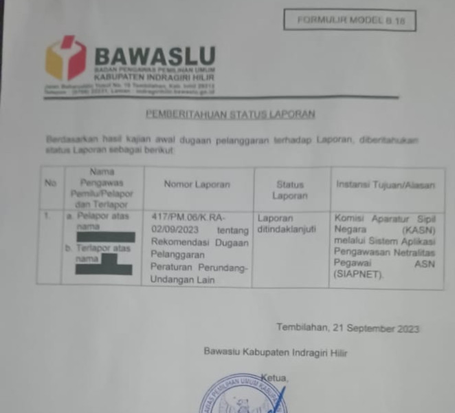 Kemudian tidak berapa lama, dua hari setelah dilaporkan, persisnya tanggal 21 September 2023 ternyata Bawaslu Inhil setelah menerima laporan tersebut langsung menerbitkan serta mengumumkan status laporan dugaan pelanggaran netralitas ASN tersebut dengan meneruskannya ke pihak KASN untuk diproses oleh intansi yang berwenang atas pelanggaran netralitas ASN tersebut.