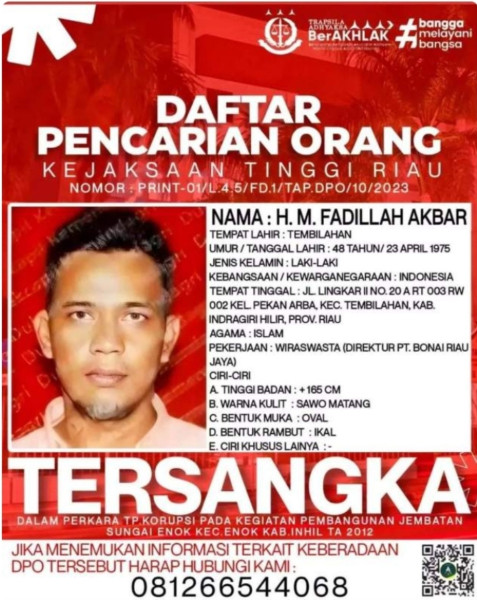 “Benar. Yang bersangkutan (HM Fadillah) ditetapkan sebagai Daftar Pencarian Orang Kejaksaan Tinggi Riau Nomor : PRINT 01/L.4.5/FD.1/TAP.DPO/10/2023 tertanggal 19 Oktober 2023,” ujar Kepala Seksi (Kasi) Penerangan Hukum (Penkum) dan Humas Kejati Riau, Bambang Heripurwanto, kepada media Rabu (1/11).