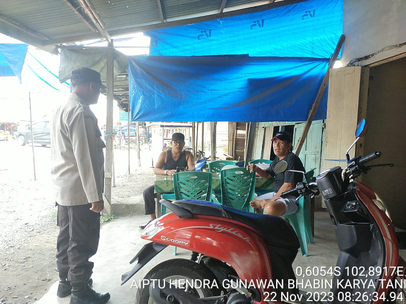 KILASRIAU.com - Bhabinkamtibmas Desa Karya Tani Polsek Kempas Polres Inhil Aiptu Hendra Gunawan bersilaturahmi dengan masyarakat di wilayah desa binaannya, Rabu (22/11/2023).