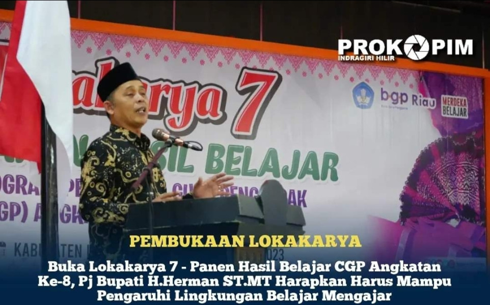 KILASRIAU.com - Pj Bupati Inhil H.Herman, SE.MT membuka lokakarya 7 - panen hasil belajar calon guru penggerak angkatan ke-8 Kabupaten Indragiri Hilir di Gedung Engku Kelana Tembilahan, Minggu (3/12/2023).