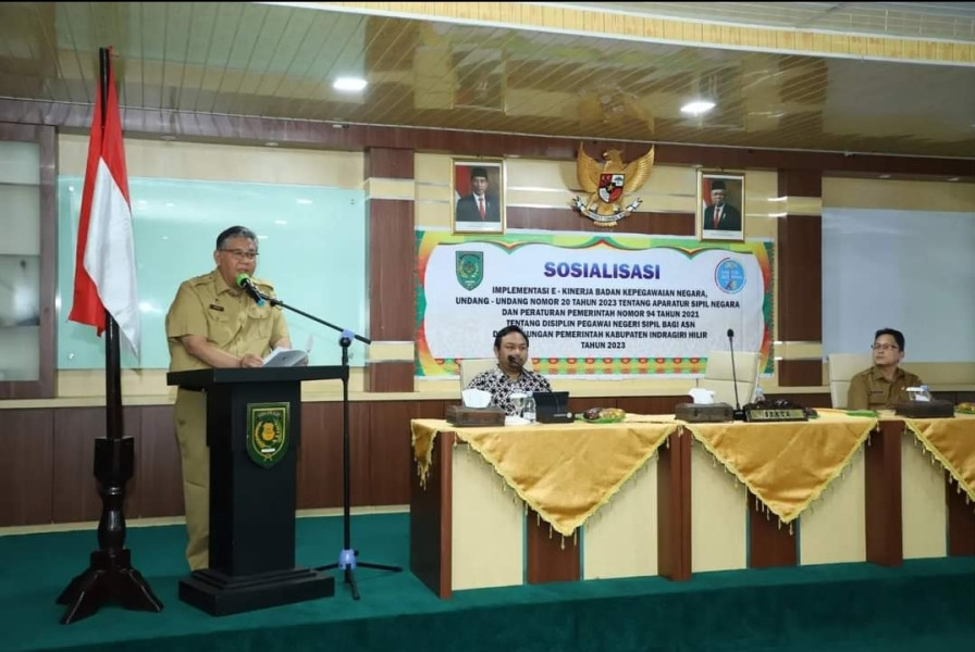 Penjabat Bupati Indragiri Hilir yang diwakili Sekretaris Daerah H. Afrizal membuka sosialisasi implementasi E-Kinerja BKN, UU No. 20 Th. 2023 Tentang ASN & PP No. 94 Th. 2021 tentang disiplin bagi ASN di Lingkungan Pemkab Inhil, Selasa (5/12/2023).