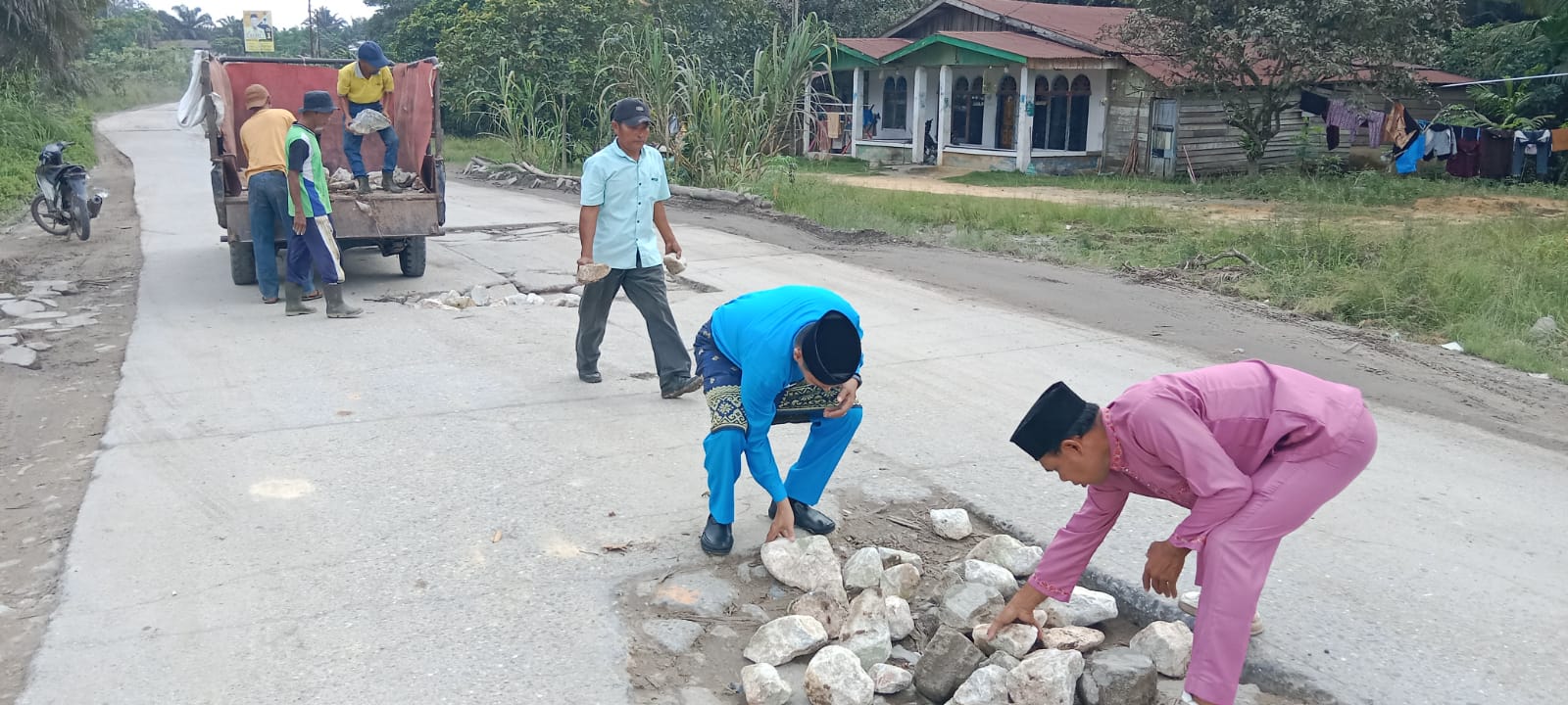 "Pemerintah Kampung dan masyarakat hari ini melakukan gotong royong menutupi lobang-lobang Jalan yg rusak dengan material batu dan pasir, kegiatan ini sudah rutin dilakukan apa lagi di musim hujan banyak Jalan yang makin rusak, sudah dua tahun terakhir kondisi jalan seperti ini", tambahnya.