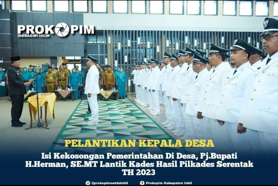 KILASRIAU.com - Senin (18/12/2023) siang bertempat di Gedung Engku Kelana Jl.Baharuddin Yusuf Pj.Bupati H.Herman, SE.MT secara lansung melantik Kepala Desa (Kades) hasil Pemilihan Kepala Desa (Pilkades) serentak TH 2023.