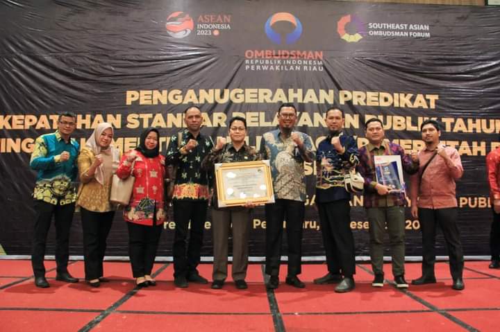 Piagam tersebut diserahkan oleh Kepala Biro Organisasi Setdaprov Riau Dr. Kemal mewakili Gubernur Riau didampingi Kepala Ombudsman Perwakilan Provinsi Riau Bambang Pratama dalam acara penganugerahan predikat kepatuhan standar pelayanan publik (KSPP) tahun 2023 Tingkat Kementerian/Lembaga/Pemerintah Daerah se Provinsi Riau, Selasa 19 Desember 2023, bertempat di Ballroom Hotel The Premiere Pekanbaru.