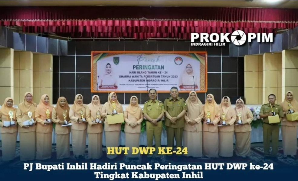 KILASRIAU.com - PJ Bupati Inhil, H. Herman menghadiri puncak peringatan Hari Ulang Tahun(HUT) ke-24 Dharma Wanita Persatuan (DWP) Kabupaten Inhil, Selasa (19/12/2023) siang di Gedung Engku Kelana, Jl. Baharuddin Yusuf Tembilahan.