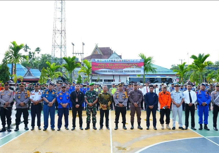 Upacara gelar pasukan serentak Operasi Lilin Lancang Kuning 2023 yang dipusatkan di Halaman Mapolres Inhil dalam rangka Pengamanan Natal 2023 dan tahun Baru (Nataru) 2024 yang dipimipin Wakapolres Inhil Kompol Indra Lukman Prabowo, SH, SIK, M.Si