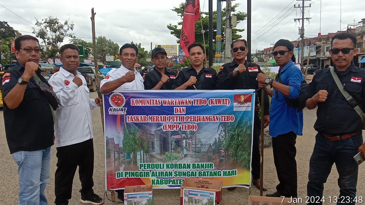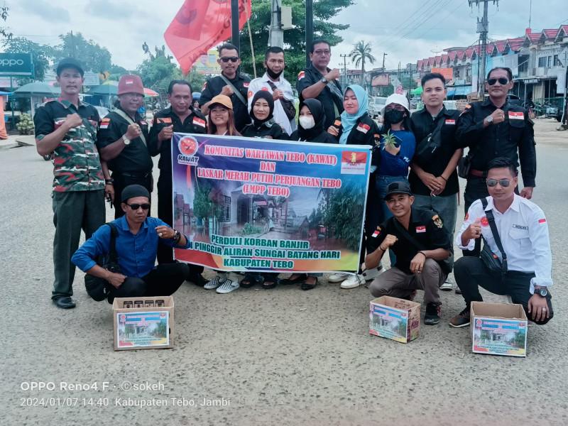 Kilasriau.com - Komonitas wartawan Tebo( KAWAT) Bersama Laskar Merah Putih Perjuangan (LMPP) Turun ke jalan yg di komando kan oleh komandan BRIGADE LMPP MARCAP TEBO ,Helmi Jimy menggalang dana untuk korban terdampak bencana alam banjir di wilayah Kabupaten Tebo, bertempat di Jalan Pahlawan Kelurahan Wirotho Agung Kecamatan Rimbo Bujang, Minggu (07/01/2024).