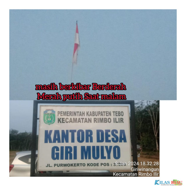 Kilasriau.com - PJ kades Giri Mulyo Kecamatan Rimbo Ilir kabupaten Tebo di Duga Tidak Peduli atas Bendera Merah Putih Berkibar Sampai Malam Hari, Senin (8/01/ 2024)